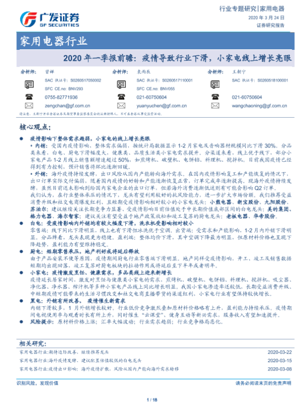 【广发证券】【20200324】2020年一季报前瞻:疫情导致行业下滑,小家电线上增长亮眼-18页 行业研究