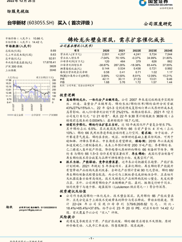 【国金证券】【20221225】国金证券-台华新材-603055.SH-锦纶龙头壁垒深筑,需求扩容催化成长-26页 行业研究
