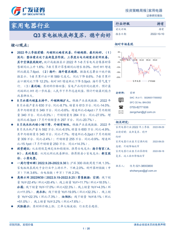 【广发证券】【20221010】家用电器行业:Q3家电板块底部复苏,稳中向好-20页 行业研究