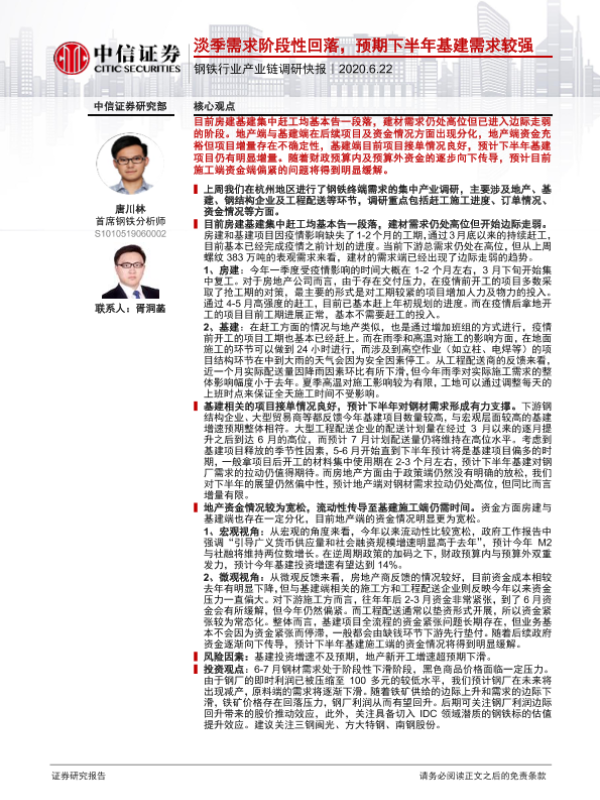 【中信证券】【20200622】20200622-中信证券-钢铁行业产业链调研快报:淡季需求阶段性回落,预期下半年基建需求较强-2页 行业研究