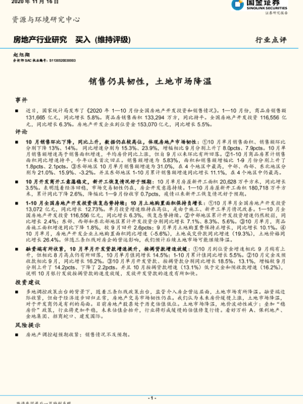 【国金证券】【20201116】房地产行业研究:销售仍具韧性,土地市场降温-10页 行业研究
