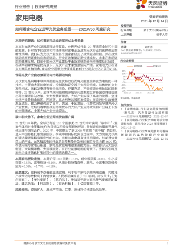 【天风证券】【20211214】家用电器2021W50周度研究:如何看家电企业进军光伏业务前景-18页 行业研究