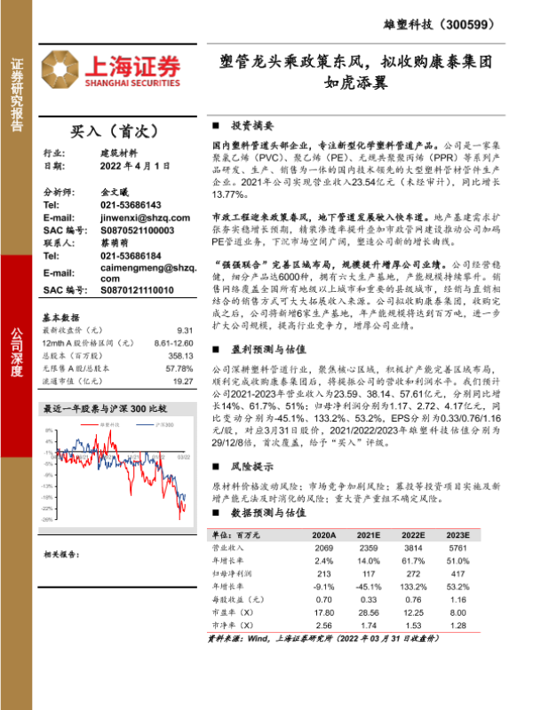 【上海证券】【20220401】雄塑科技-300599.SZ-塑管龙头乘政策东风,拟收购康泰集团如虎添翼-24页 行业研究