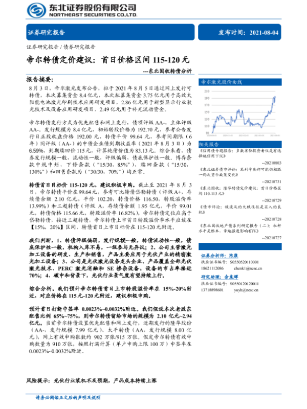 【东北证券】【20210804】固收转债分析:帝尔转债定价建议,首日价格区间115-120元-15页 行业研究