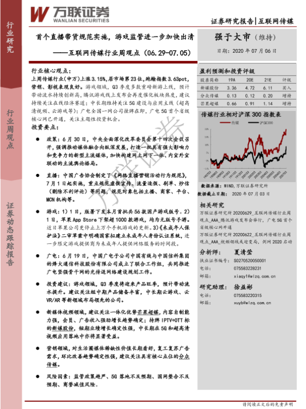 【万联证券】【20200706】互联网传媒行业周观点:首个直播带货规范实施,游戏监管进一步加快出清-14页 行业研究