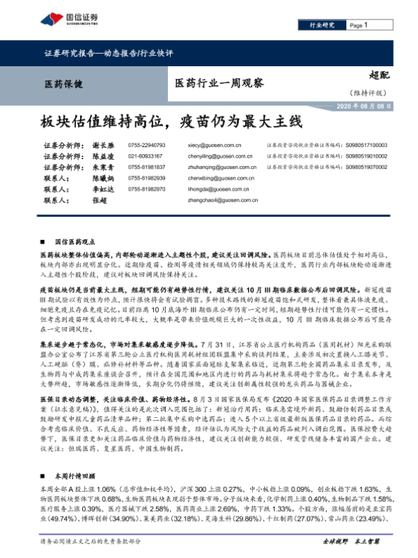 【国信证券】【20200808】医药行业一周观察:板块估值维持高位,疫苗仍为最大主线-12页 行业研究