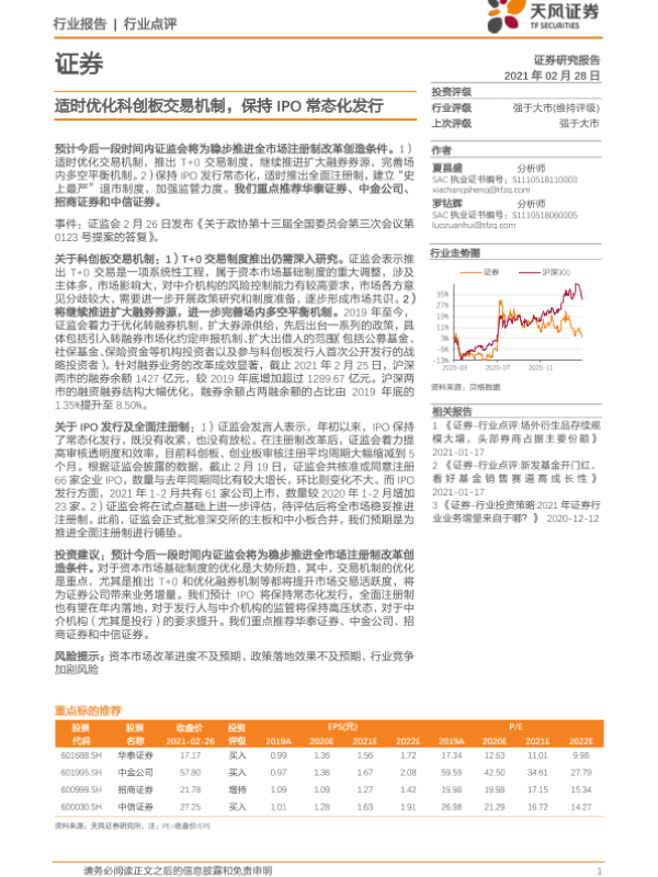 【天风证券】【20210228】证券行业点评:适时优化科创板交易机制,保持IPO常态化发行-2页 行业研究