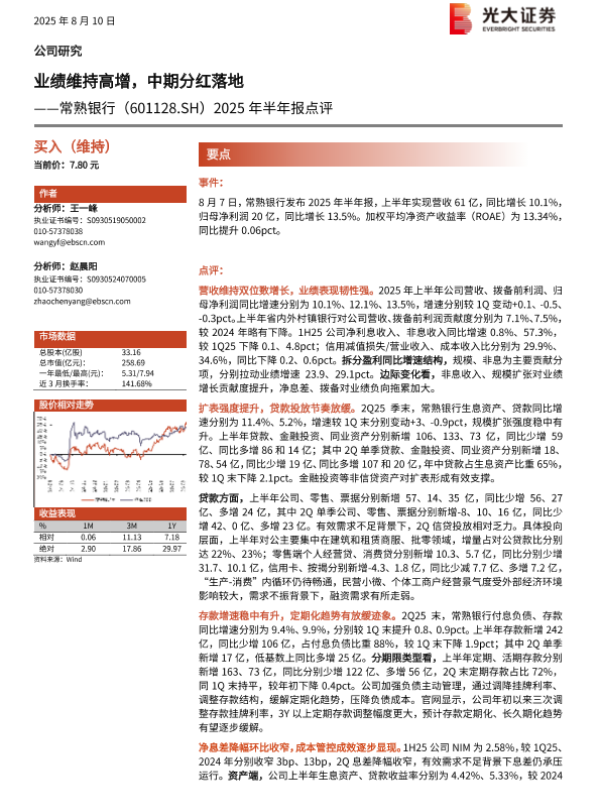 【光大证券】【20250810】常熟银行2025年半年报点评:业绩维持高增,中期分红落地-7页 证券期货研究报告