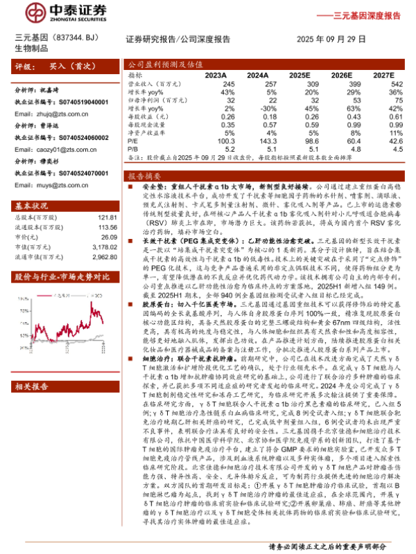 【中泰证券】【202509】三元基因(920344)深度报告:干扰素“小而美”,胶col蛋白+细胞治疗打造新曲线-18页 证券期货研究报告