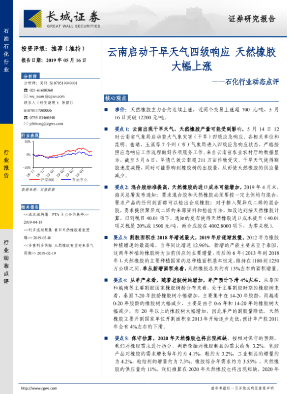 【长城证券】【20190516】云南启动干旱天气四级响应 天然橡胶大幅上涨-3页 行业研究