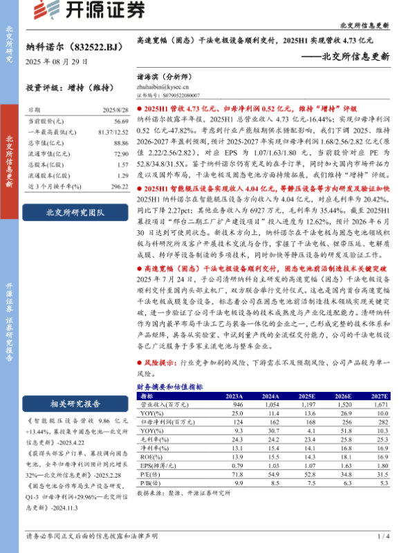【开源证券】【20250829】纳科诺尔-高速宽幅(固态)干法电极设备顺利交付_2025H1实现营收4.73亿元-4页 证券期货研究报告