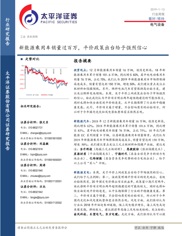 【太平洋证券】【20190113】电气设备行业周报:新能源乘用车销量过百万,平价政策出台给予强烈信心-18页 行业研究