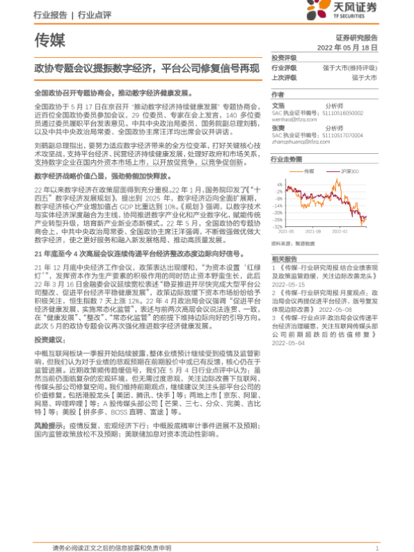 【天风证券】【20220518】政协专题会议提振数字经济,平台公司修复信号再现-2页 行业研究