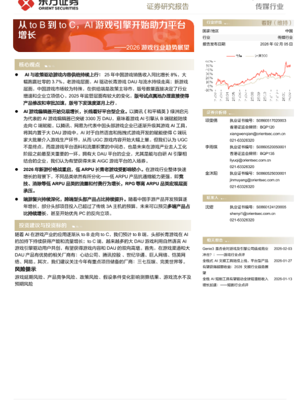 【东方证券】【202602】2026游戏行业趋势展望:从to B到to C,AI游戏引擎开始助力平台增长-15页 证券期货研究报告