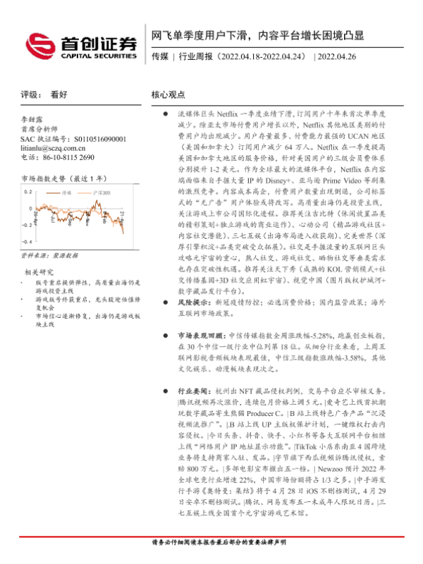 【首创证券】【20220426】网飞单季度用户下滑,内容平台增长困境凸显-16页 行业研究