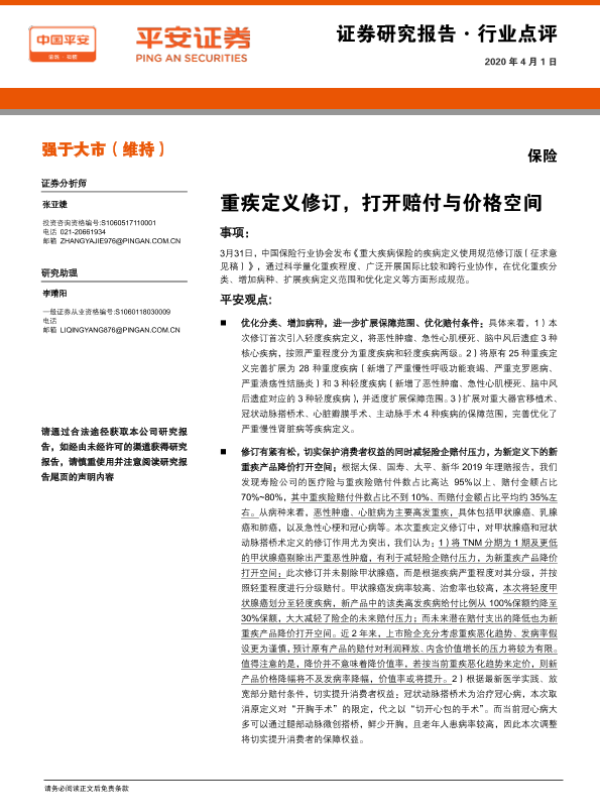 【平安证券】【20200401】保险:重疾定义修订,打开赔付与价格空间-3页 行业研究