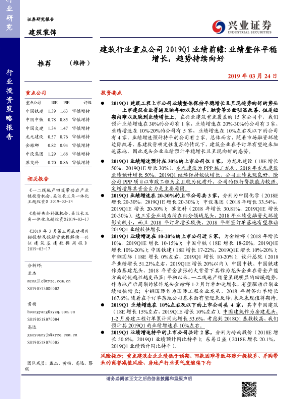 【兴业证券】【20190324】建筑行业重点公司2019Q1业绩前瞻 业绩整体平稳增长,趋势持续向好-4页 行业研究