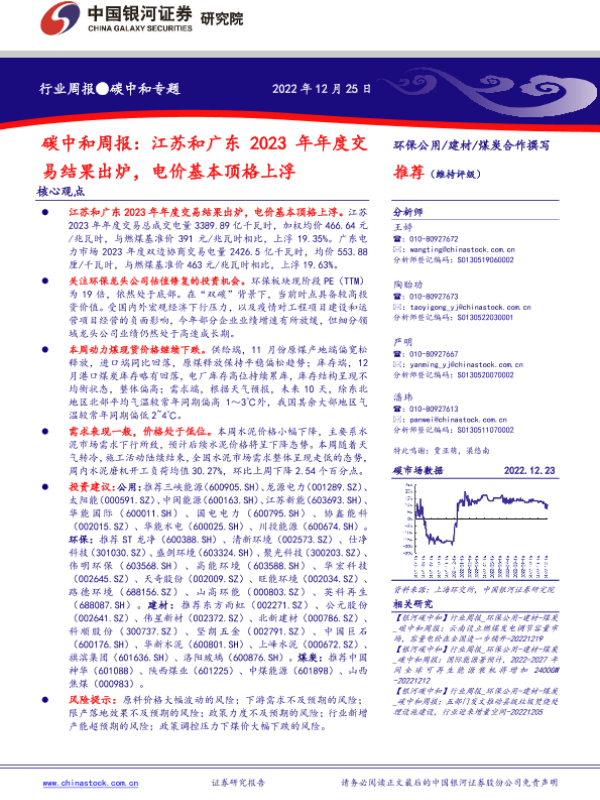 【银河证券】【20221225】碳中和周报:江苏和广东2023年年度交易结果出炉,电价基本顶格上浮-23页 行业研究