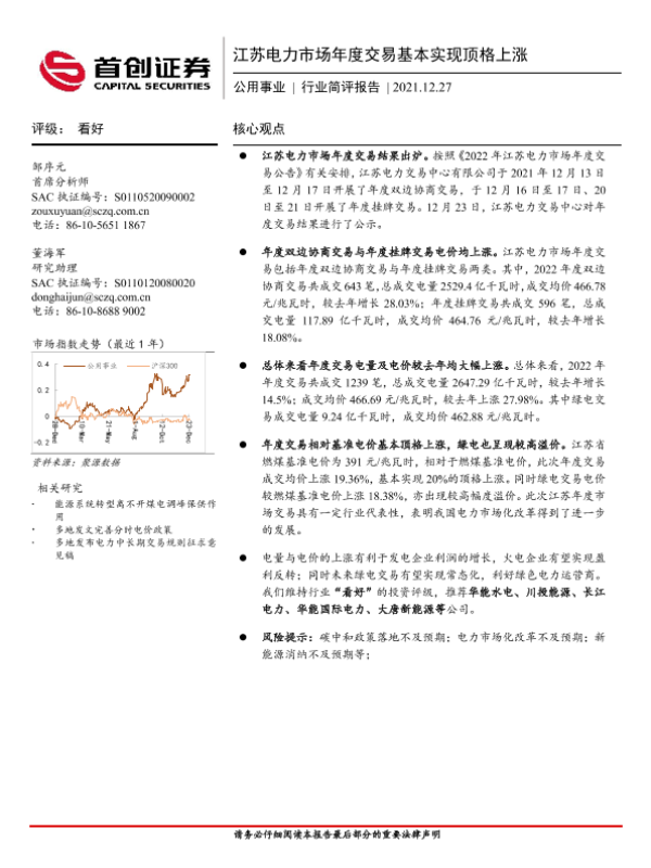 【首创证券】【20211227】江苏电力市场年度交易基本实现顶格上涨-6页 行业研究