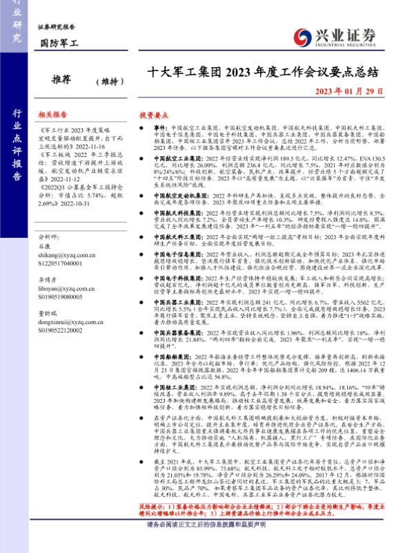 【兴业证券】【20230129】十大军工集团2023年度工作会议要点总结-15页 行业研究