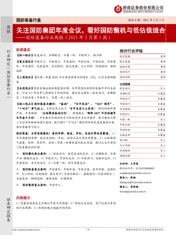 【浙商证券】【20210201】20210201-浙商证券-国防装备行业周报:关注国防集团年度会议,看好国防整机与低估值组合-9页 行业研究