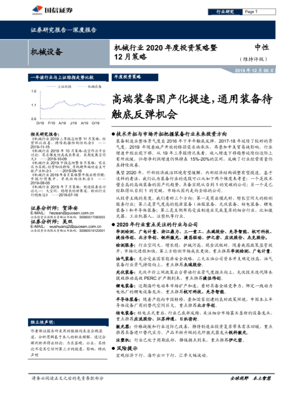 【国信证券】【20191206】机械行业2020年度投资策略暨12月策略:高端装备国产化提速,通用装备待触底反弹机会-90页 行业研究