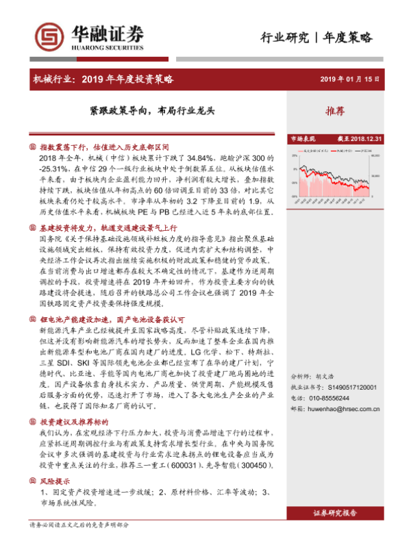 【华融证券】【20190115】机械行业:2019年年度投资策略:紧跟政策导向,布局行业龙头-22页 行业研究