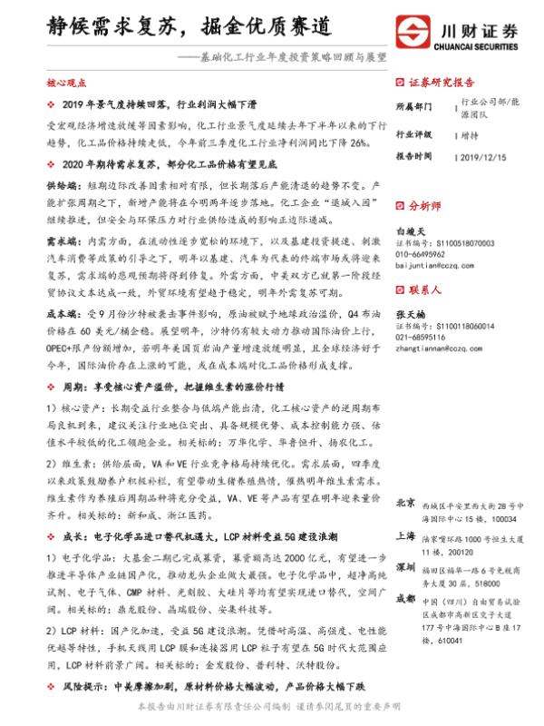 【川财证券】【20191215】基础化工行业年度投资策略回顾与展望:静候需求复苏,掘金优质赛道-21页 证券期货研究报告