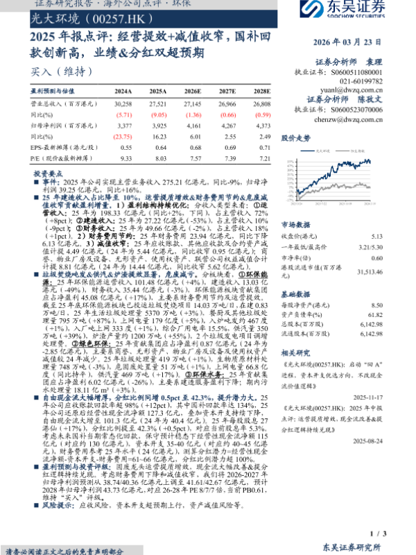 【东吴证券】【202603】光大环境(00257.HK):2025年报点评:经营提效+减值收窄,国补回款创新高,业绩&分红双超预期-3页 证券期货研究报告
