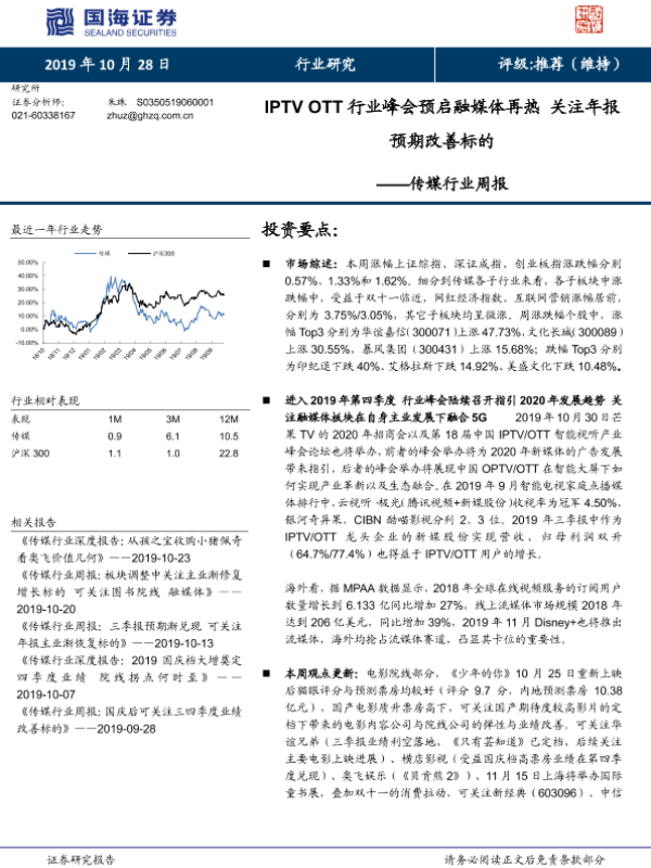 【国海证券】【20191028】20191028-国海证券-传媒行业周报:IPTV OTT行业峰会预启融媒体再热 关注年报预期改善标的-16页 行业研究