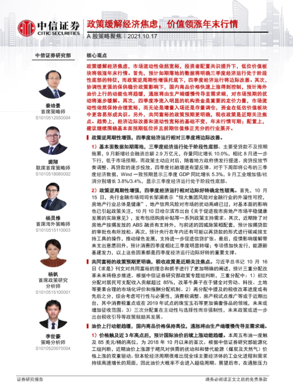 【中信证券】【20211017】A股策略聚焦:政策缓解经济焦虑,价值领涨年末行情-18页 行业研究