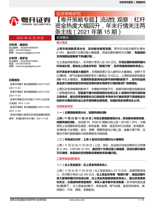 【粤开证券】【20211129】【粤开策略专题】流动性观察:杠杆资金热度大幅回升,年末行情关注两条主线-16页 行业研究