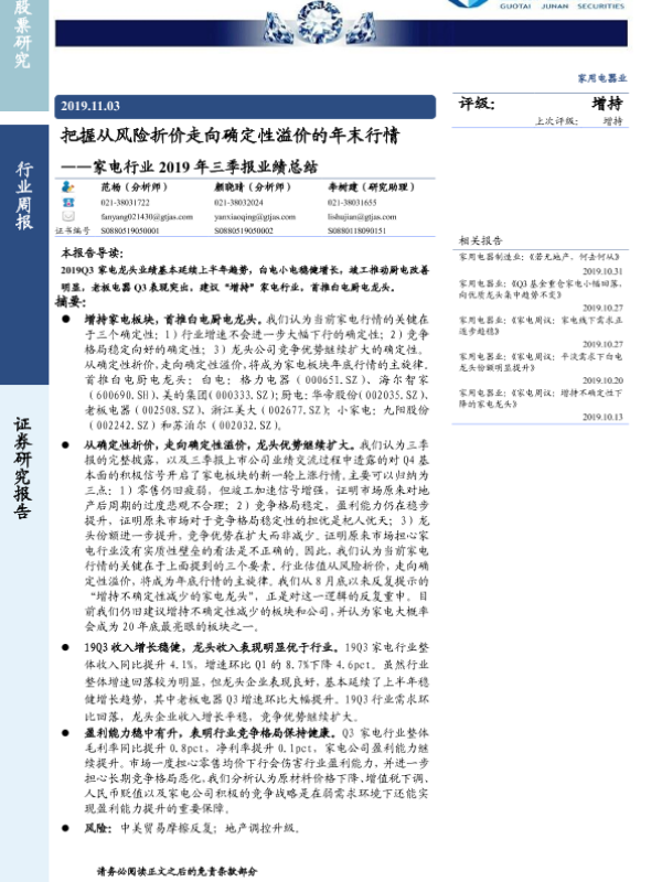 【国泰君安证券】【20191103】2019年三季报业绩总结:把握从风险折价走向确定性溢价的年末行情-25页 行业研究
