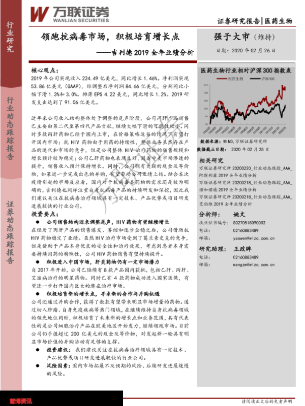 【万联证券】【20200226】医药生物:吉利德2019全年业绩分析-领跑抗病毒市场,积极培育增长点-8页 行业研究