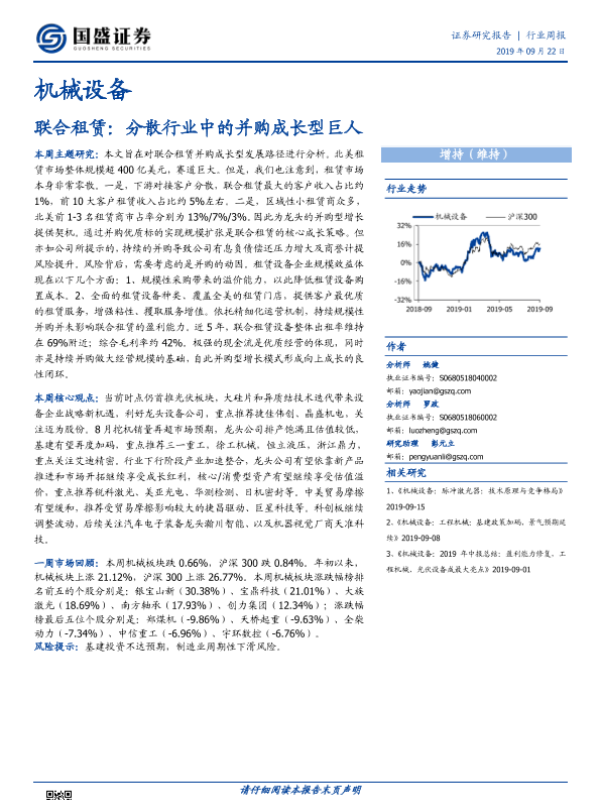 【国盛证券】【20190922】机械设备行业周报:联合租赁:分散行业中的并购成长型巨人-13页 行业研究