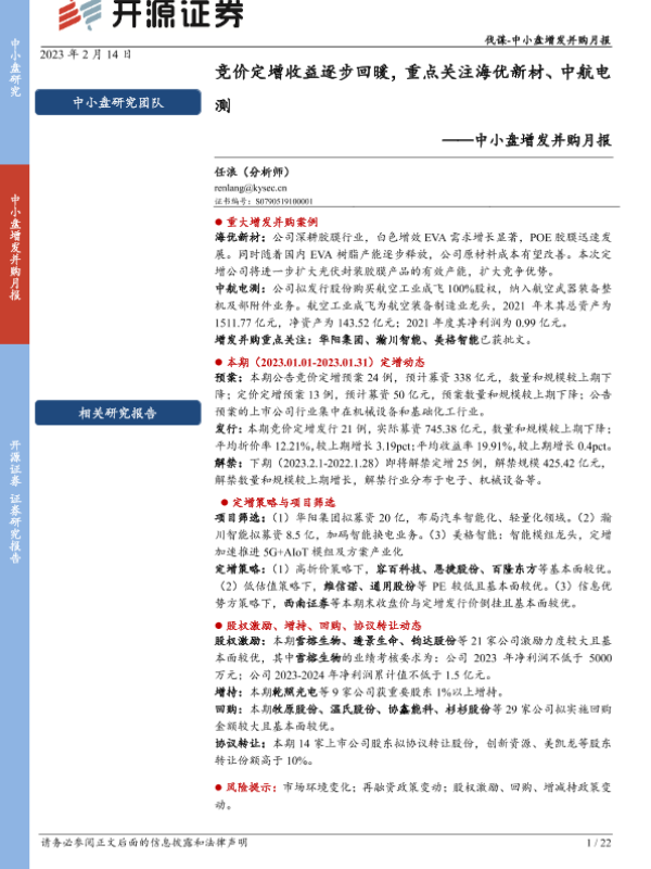 【开源证券】【20230214】中小盘增发并购月报:竞价定增收益逐步回暖,重点关注海优新材、中航电测-22页 行业研究