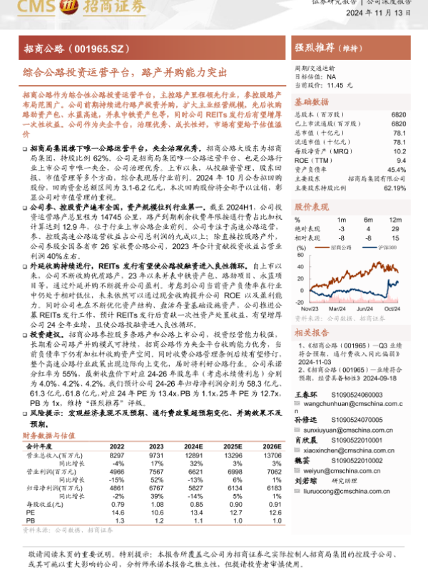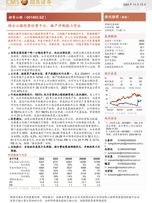 【海通证券】【20241113】招商公路(001965)综合公路投资运营平台,路产并购能力突出-18页 行业研究