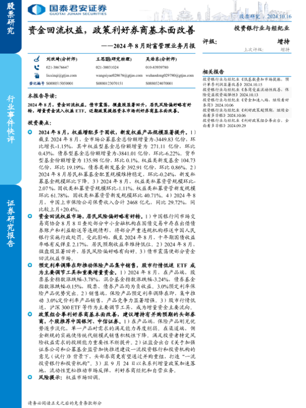 【国泰君安证券】【20241016】投资银行业与经纪业行业2024年8月财富管理业务月报:资金回流权益,政策利好券商基本面改善-13页 行业研究