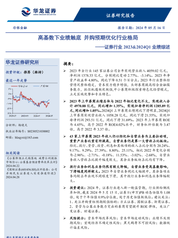 【华龙证券】【20240516】证券行业2023&2024Q1业绩综述:高基数下业绩触底,并购预期优化行业格局-23页 行业研究