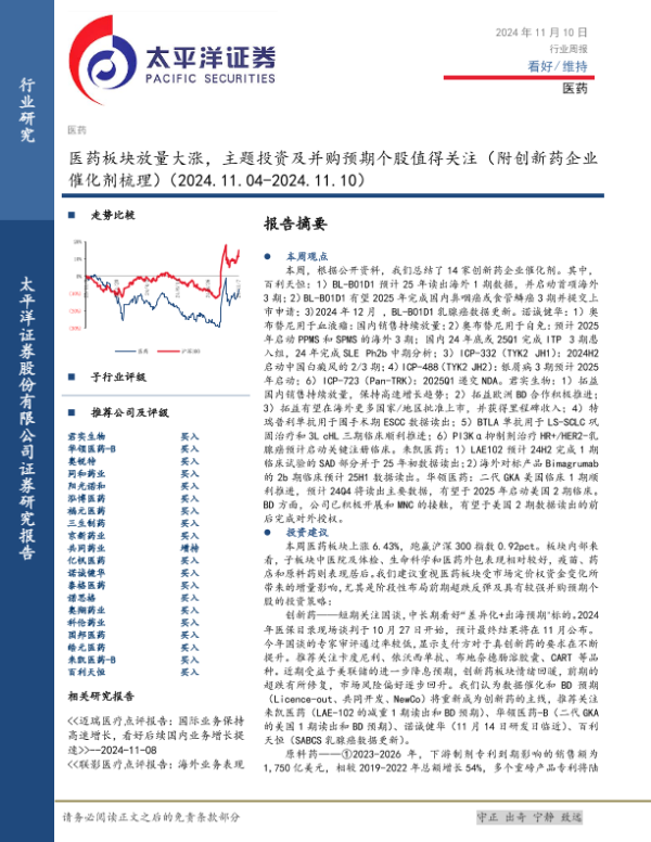 【太平洋证券】【20241110】医药板块放量大涨,主题投资及并购预期个股值得关注(附创新药企业催化剂梳理)-21页 行业研究