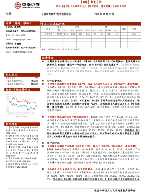 【中泰证券】【20211128】《幻塔》热度分析-对比《原神》、《天涯明月刀》、《哈利波特:魔法觉醒》B站评论情况-4页 行业研究