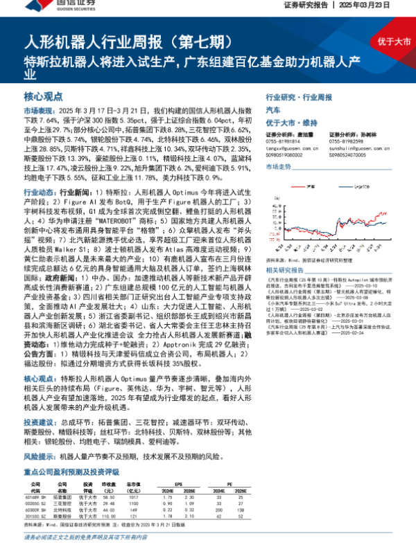 【国信证券】【20250323】20250323-国信证券-人形机器人行业周报(第七期):特斯拉机器人将进入试生产,广东组建百亿基金助力机器人产业-13页 行业研究