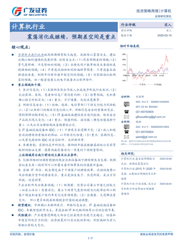 【广发证券】【20200315】20200315-广发证券-计算机行业投资策略周报:震荡消化或继续,预期差空间是重点-7页 行业研究