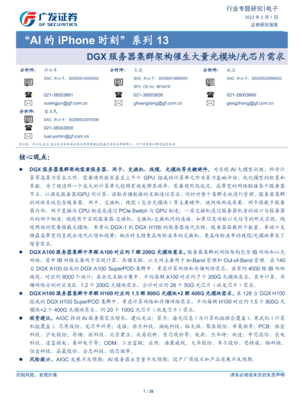 【广发证券】【20230501】“AI的iPhone时刻”系列13:DGX服务器集群架构催生大量光模块光芯片需求-26页 行业研究