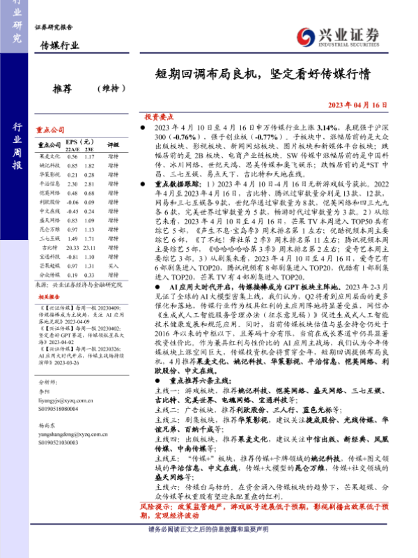 【兴业证券】【20230416】短期回调布局良机,坚定看好传媒行情-24页 行业研究