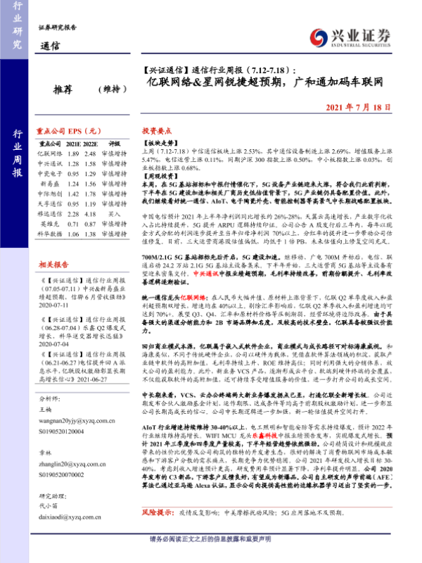 【兴业证券】【20210718】【兴证通信】通信行业周报(7.12-7.18):亿联网络&星网锐捷超预期,广和通加码车联网-25页 行业研究