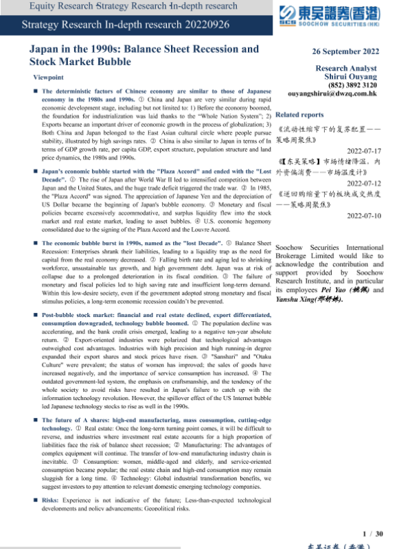 【东吴证券(香港)】【20220926】策略深度报告:日本90s,资产负债表衰退与股市泡沫-30页 行业研究