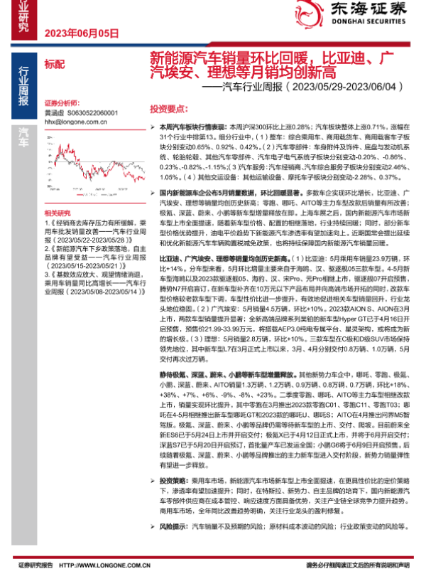 【东海证券】【20230605】新能源汽销量环比回暖,比亚迪、广汽埃安、理想等月销均创新高-13页 行业研究