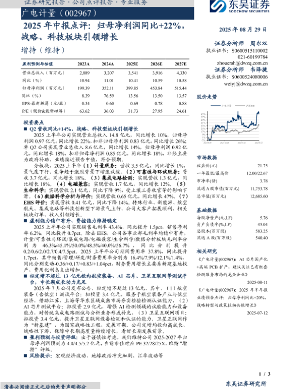 【东吴证券】【20250829】广电计量-2025年中报点评:归母净利润同比+22%,战略、科技板块引领增长-3页 证券期货研究报告