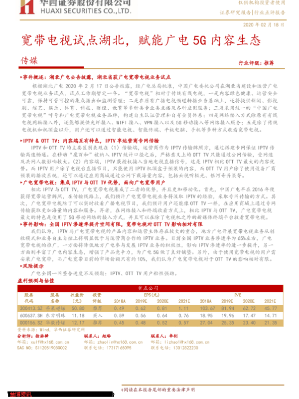 【华西证券】【20200218】宽带电视试点湖北,赋能广电5G内容生态-3页 行业研究